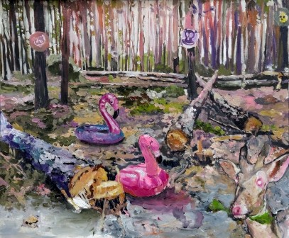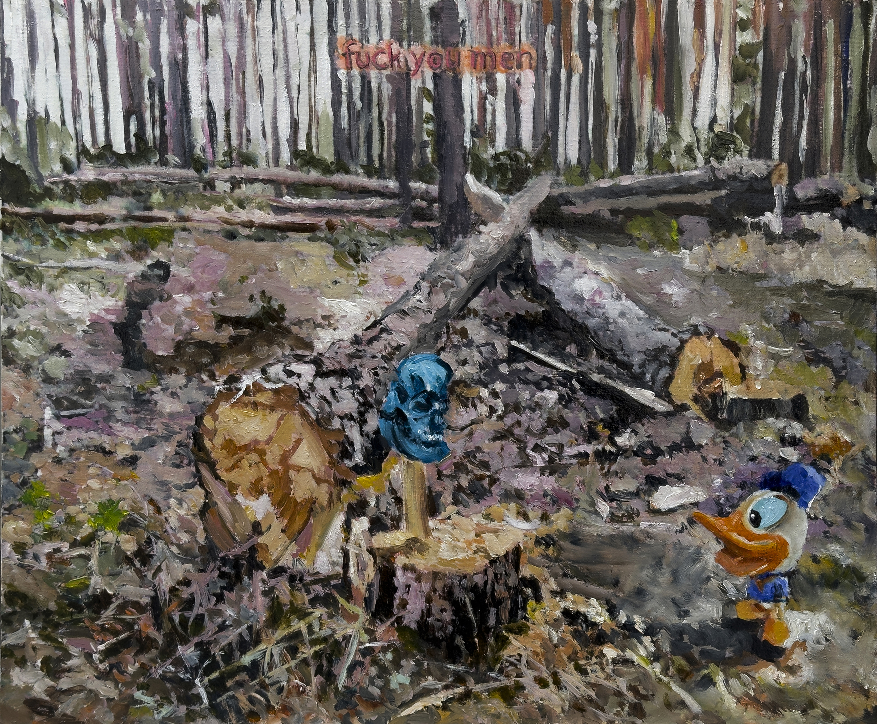 Kako u svom tekstu ističe Tena Bakšaj: “Protagonisti slika su Pajo Patak, crni Štrumpf, plastični flamingosi, božićni sobovi, lubanje, insekti i leteći proklijali krumpiri — relikti osobnih sjećanja i arhetipovi pop kulture zapadnog čovjeka koji sada dobivaju neku novu ulogu. Smješteni su u distopijske ambijente istarskih šuma među divljim deponijima koji su dobro poznati umjetniku. Sam proces nastanka slika umjetnik opisuje kao instinktivan i spontan, a prepoznatljiva ikonografija smještena je u radnje koje egzistiraju izvan aktualnog vremena i prostora.”