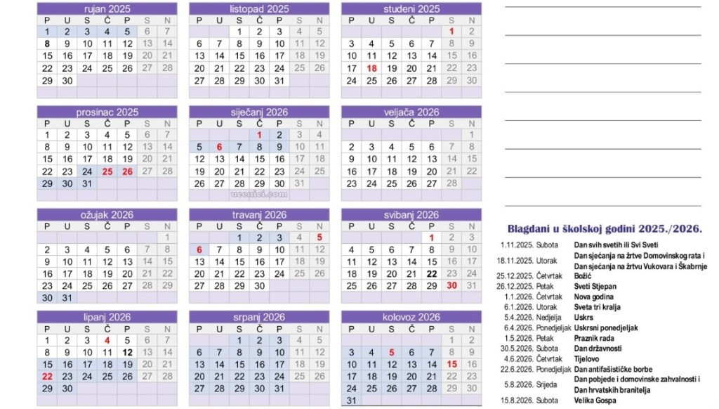 Raspored školskih praznika i državnih blagdana za školsku godinu 2025 / 2026
