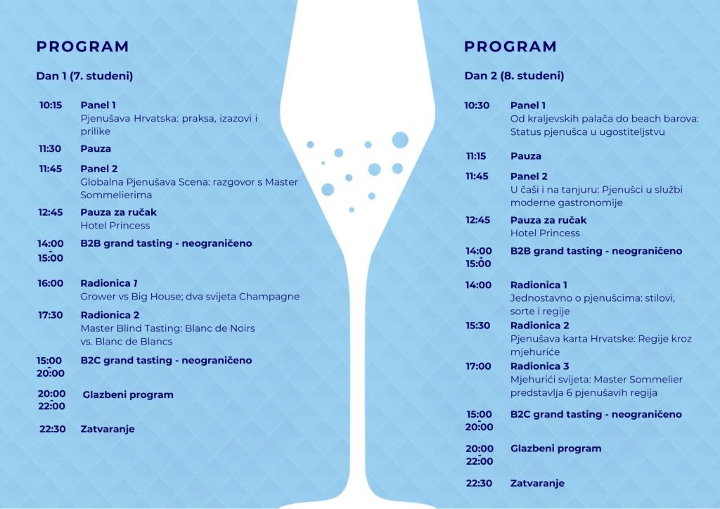 Radionice na Sparkling Wine Festu Croatia osmišljene su s ciljem pružanja edukativnog iskustva za sve sudionike. Ove stručna predavanja istražuju složeni svijet pjenušavih vina, od proizvodnje i sparivanja do njihove kulturne važnosti. Sudionici će steći dragocjene uvide u to kako se pjenušava vina isprepliću s gastronomijom, ugostiteljstvom i zabavnom industrijom. Svaka radionica ima za cilj produbiti vaše razumijevanje i cijenjenje pjenušavih vina, pružajući obogaćujuće iskustvo kako za početnike, tako i za iskusna nepca. Pridružite nam se i unaprijedite svoje znanje!