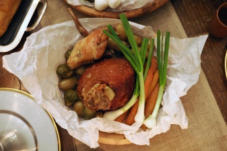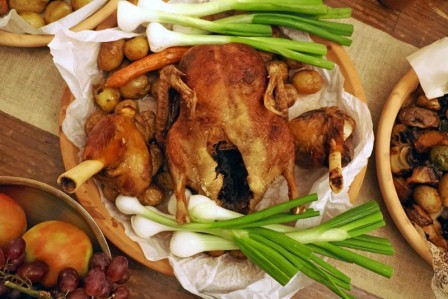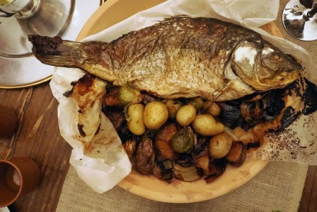 „Baš kao nekad, hranu serviramo na velike ovale, a svaki gost sam bira što će jesti i kako će kombinirati okuse. To je osobna gozba unutar zajedničkog iskustva“, objašnjava chef pokazujući što se sve obilato i kreativno nalazi na stolu. Pokazuje tako pečenu perad, kunić, svinjski but, razno povrće i domaći topli kruh. Za one koji preferiraju laganije opcije, tu je i šaran pripremljen u glinenoj posudi.